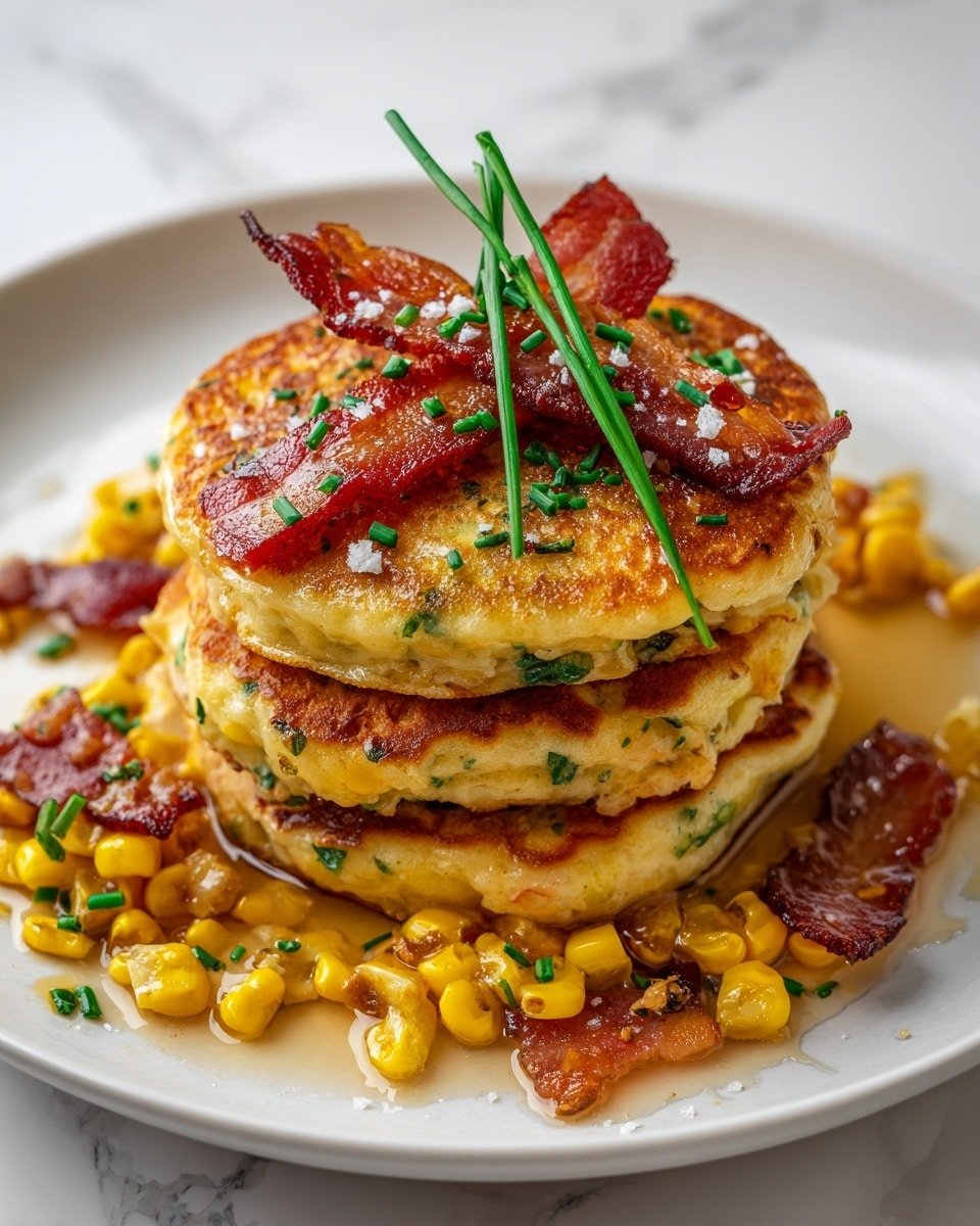 A stack of three golden brown pancakes with corn kernels and herbs visible inside each layer, placed on a white plate on a white marbled surface. The top pancake is decorated with small green chopped chives scattered around, two thin slices of crispy reddish-brown bacon, coarse salt crystals, and three long green chives laid across the bacon. Around the base of the stack are pieces of bacon and corn with a light syrup or glaze pooling slightly on the plate. The pancakes have a slightly crispy texture on the outside and look fluffy inside. Photo taken with an iphone --ar 4:5 --v 7 — Bacon and Corn Griddle Cakes with Maple Syrup, Corn Pancakes with Bacon, Breakfast Cake Recipes, Easy Brunch Recipes, Maple Syrup Pancakes