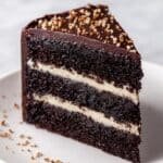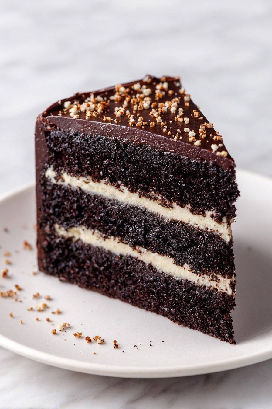 A slice of dark chocolate cake with three layers: two thick, rich black cake layers separated by two thin white cream layers. The whole cake slice is covered with a smooth, dark chocolate frosting that shines slightly, topped with small crunchy bits of dark and light brown scattered near the edge. It sits on a white plate against a white marbled texture background. photo taken with an iphone --ar 2:3 --v 7 — Black Velvet Cake, Black Velvet Cake recipe, chocolate velvet cake, deep chocolate cake, easy black velvet cake