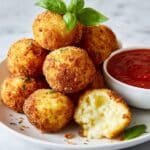 Arancini Italian Rice Balls are crispy, golden fried risotto balls stuffed with gooey mozzarella cheese and coated with a crunchy breadcrumb layer. Perfect as an appetizer or snack, these delicious treats are served with a tangy marinara dipping sauce and fresh basil garnish, bringing authentic Italian flavors to your table.