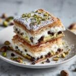 - Cool and Garnish: Allow the dessert to cool for at least 30 minutes before slicing to let the filling set. Serve chilled or at room temperature, garnished with chopped pistachios, maraschino cherries, and extra mini chocolate chips if desired.