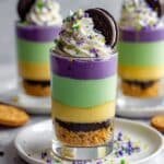 7. Assemble Trifles: In individual jars or serving glasses, layer green cake cubes, crushed Oreos, cream filling, purple cake cubes, and more crushed Oreos. Repeat layers as desired and optionally top with sprinkles for extra festive flair.