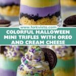 Celebrate Halloween with these fun and festive Beetlejuice Mini Trifles featuring layers of vibrant green and purple white cake cubes, creamy vanilla pudding filling, crushed Oreos, and whipped cream. Perfect for spooky parties or a thematic dessert treat, these trifles combine a colorful mix of textures and flavors that are sure to delight kids and adults alike.