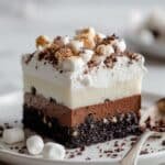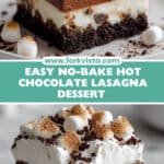 Indulge in the rich, layered delight of Hot Chocolate Lasagna, a no-bake dessert featuring a crunchy Oreo crust, creamy cream cheese layer, silky chocolate pudding, topped with whipped cream, toasted mini marshmallows, and drizzled melted chocolate for a perfect sweet treat.