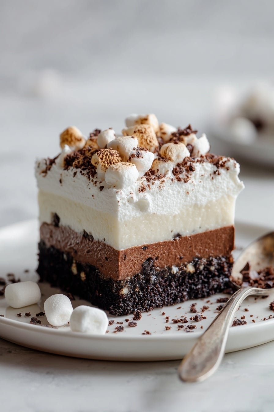 - Spread the remaining whipped topping over the set chocolate pudding layer. This creates a soft, cloud-like finish. Then evenly scatter mini marshmallows on top — their pillowy, delicate sweetness adds a fun contrast. If you have a kitchen torch, lightly toast these marshmallows just until golden brown for that irresistible caramelized aroma and a little crunch.