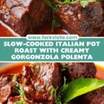This Italian Pot Roast (Stracotto) is a hearty and comforting dish featuring a tender, slow-braised chuck roast infused with aromatic vegetables, pancetta, garlic, red wine, and Italian herbs. It is paired perfectly with creamy, oven-baked Gorgonzola polenta that adds a rich, cheesy complement to the flavorful meat.