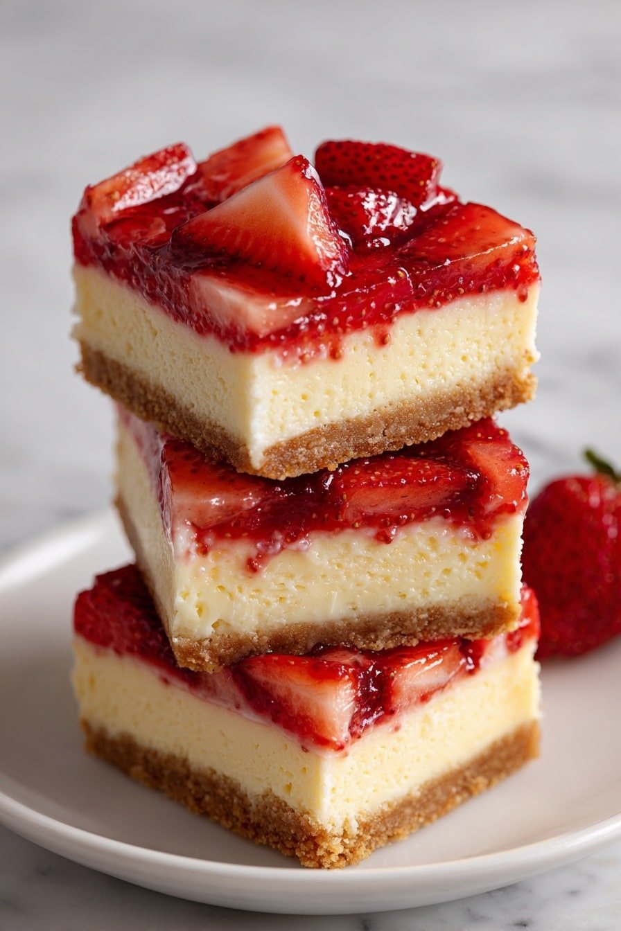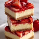 - Add the topping and serve: Just before serving, top the cheesecake bars with fresh sliced strawberries for a fresh, sweet garnish.