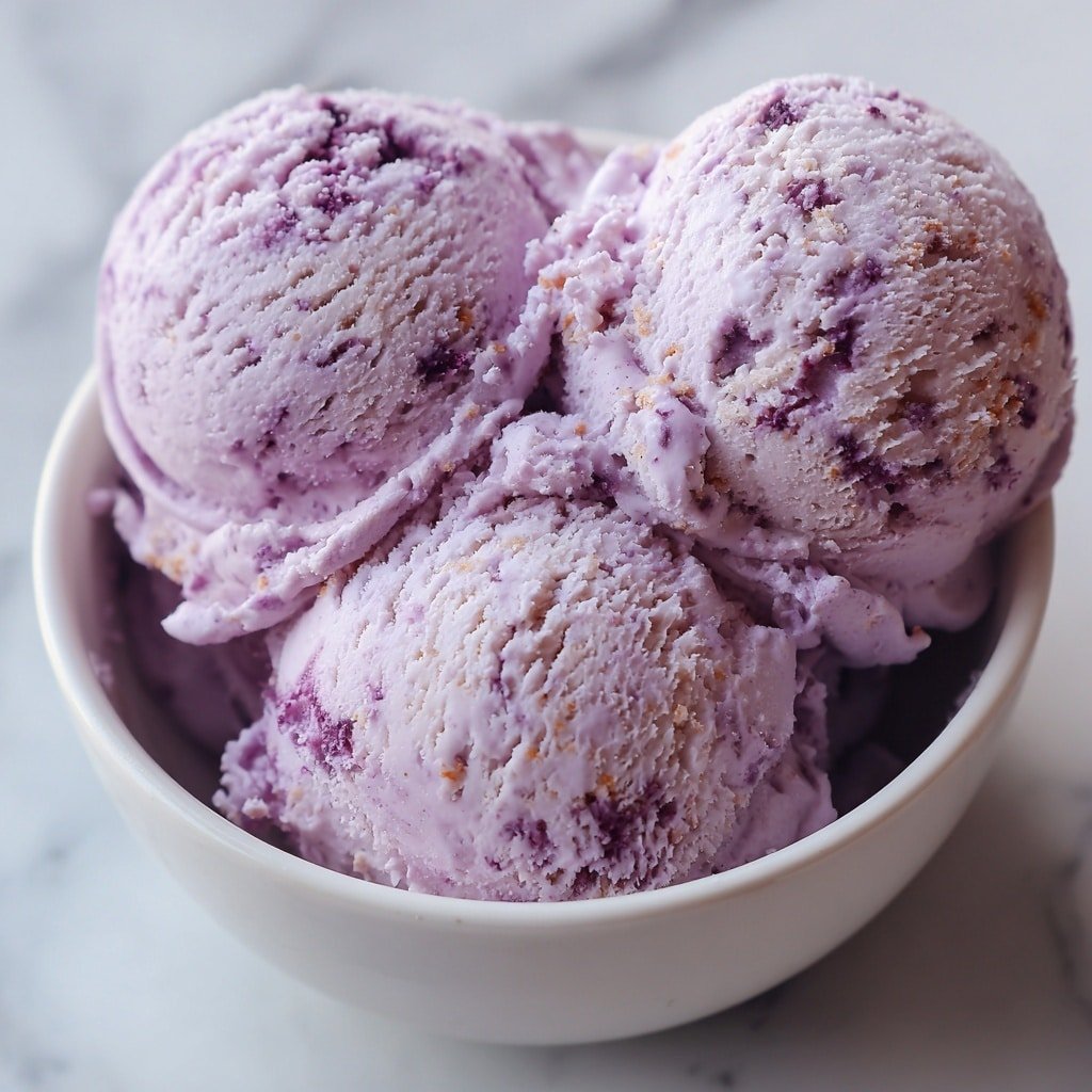 A white bowl filled with three scoops of light purple ice cream, each scoop showing a rough, creamy texture and small dark purple bits mixed inside. The scoops sit on top of each other, the top scoop being the most rounded and smooth. The bowl rests on a white marbled surface in soft light. photo taken with an iphone --ar 1:1 --v 7 — Low Carb Blueberry Frozen Yogurt, healthy frozen yogurt with blueberries, keto-friendly frozen dessert, homemade low carb yogurt, easy berry frozen yogurt