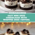 - Pipe or spoon the Oreo whipped cream onto each mini cheesecake just before serving — the cold, airy topping contrasts perfectly with the dense filling.
