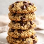 These Peanut Butter Oatmeal Chocolate Chip Cookies are a deliciously wholesome treat combining creamy peanut butter, hearty rolled oats, and sweet chocolate chips. Perfectly chewy with a hint of honey sweetness, they make a quick and easy snack or dessert that’s naturally gluten-free and can be made vegan by using maple syrup.
