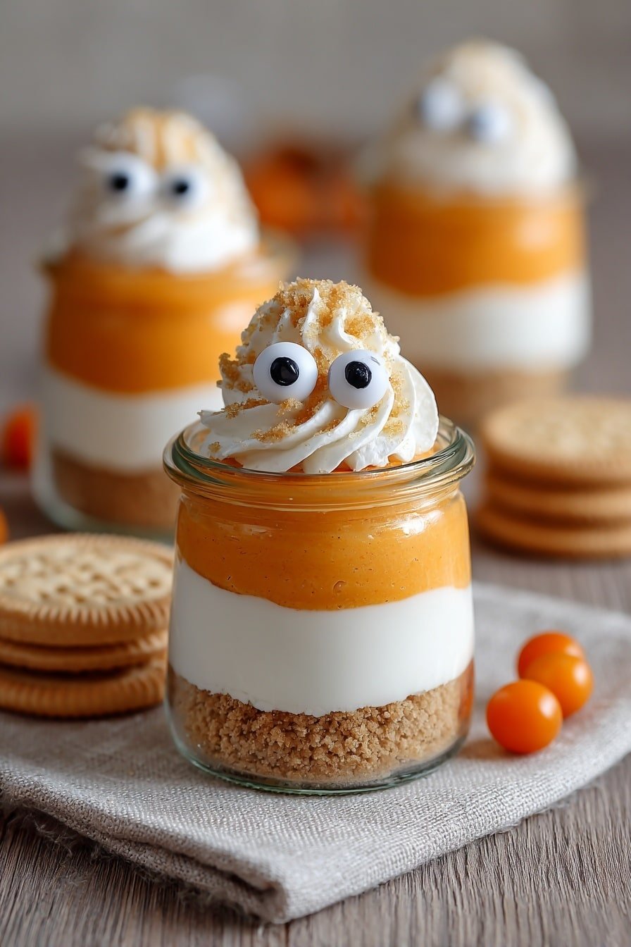 - Decorate: Garnish the tops of the jars with mini cookies, candy eyes, and a sprinkle of graham cracker crumbs to create a fun, spooky appearance.