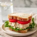 The image shows a sandwich on a white plate with a light brown rim, placed on a beige napkin over a white marbled surface. The sandwich has three visible layers between two slices of white bread. The bottom layer is a creamy chicken salad mixed with small green herbs. Above it are thick slices of red tomato, and on top are several large, crisp green lettuce leaves. In the background, there is a clear glass of water with a lemon wedge. The scene is softly lit with natural light and has a calm, minimal look. photo taken with an iphone --ar 4:5 --v 7 — Tuna Salad Toast, Tuna Salad Toast Recipe, easy tuna toast, quick lunch ideas, healthy tuna snack